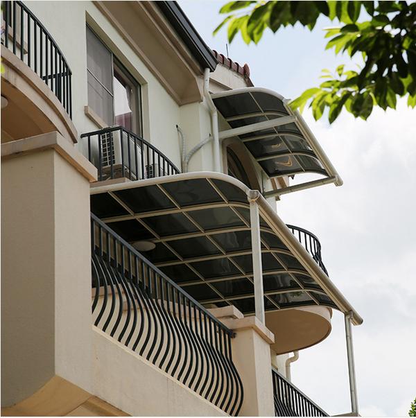 這種雨棚是從2007年日本引進到國內(nèi),之前已經(jīng)在全國有很大的使用范圍,安全性高,材質(zhì)輕,外觀漂亮。性價比也很高,在別墅區(qū)和自建房中使用的很多。隨著近幾年使用率逐漸增加,鋁合金雨棚也越來越普及,在顏色樣式上更多選擇,設(shè)計造型更加美觀。