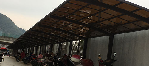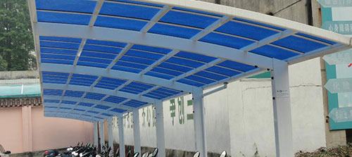 自行車停車棚頂棚采用進(jìn)口聚碳酸酯板,抗沖擊是玻璃的數(shù)百倍,有效防止高空墜物