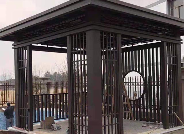 2、 新中式鋁合涼亭可加工性好,可訂、可刨、可鋸、可鉆、可彎可直,可圓可方,可制作各種木制品無法制作的造型。