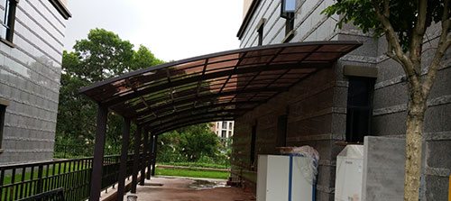 頂棚采用進(jìn)口聚碳酸酯板,抗沖擊比玻璃強(qiáng),有效防止高空墜物