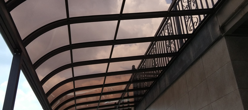 頂棚采用進(jìn)口聚碳酸酯板,抗沖擊是玻璃的數(shù)百倍,有效防止高空墜物
